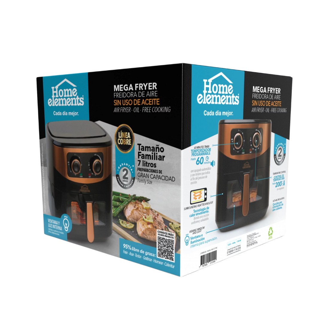 Es hora de alimentarte más saludable con la Nueva Freidora de Aire de 7L Mega Fryer de Home Elements. Su gran capacidad es ideal para toda la familia. Realiza preparaciones con 95% menos de grasa y colesterol. Además de freír puedes asar, tostar, gratinar, calentar. Muchas opciones en un sólo producto.