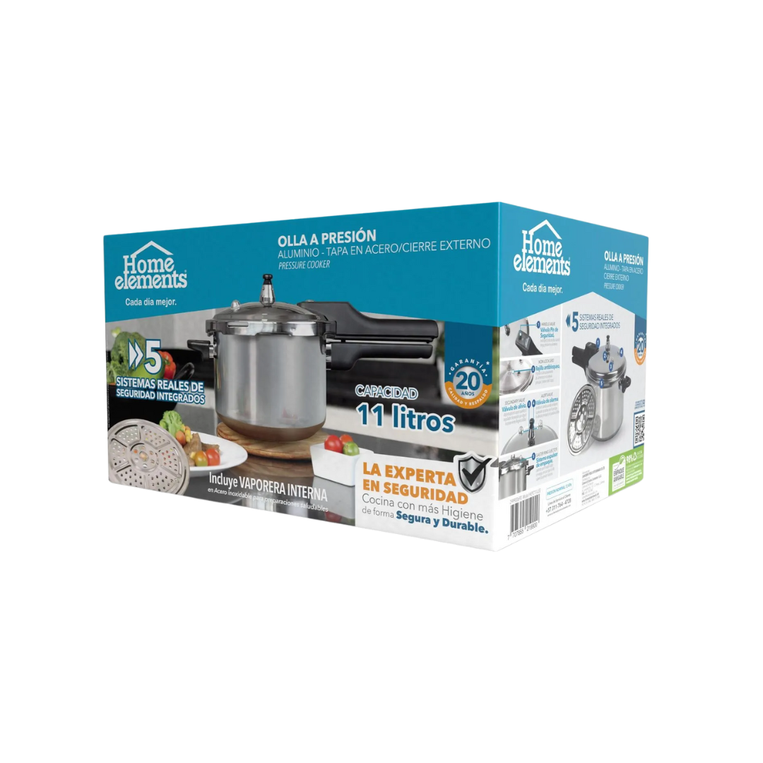 Olla a presion capacidad de 11 litros, presion nominal de 72 Kpa, cuerpo en aluminio y tapa en acero Inoxidableidable, cierre externo, apta para estufas electricas y a gas, versatil y facil de usar.