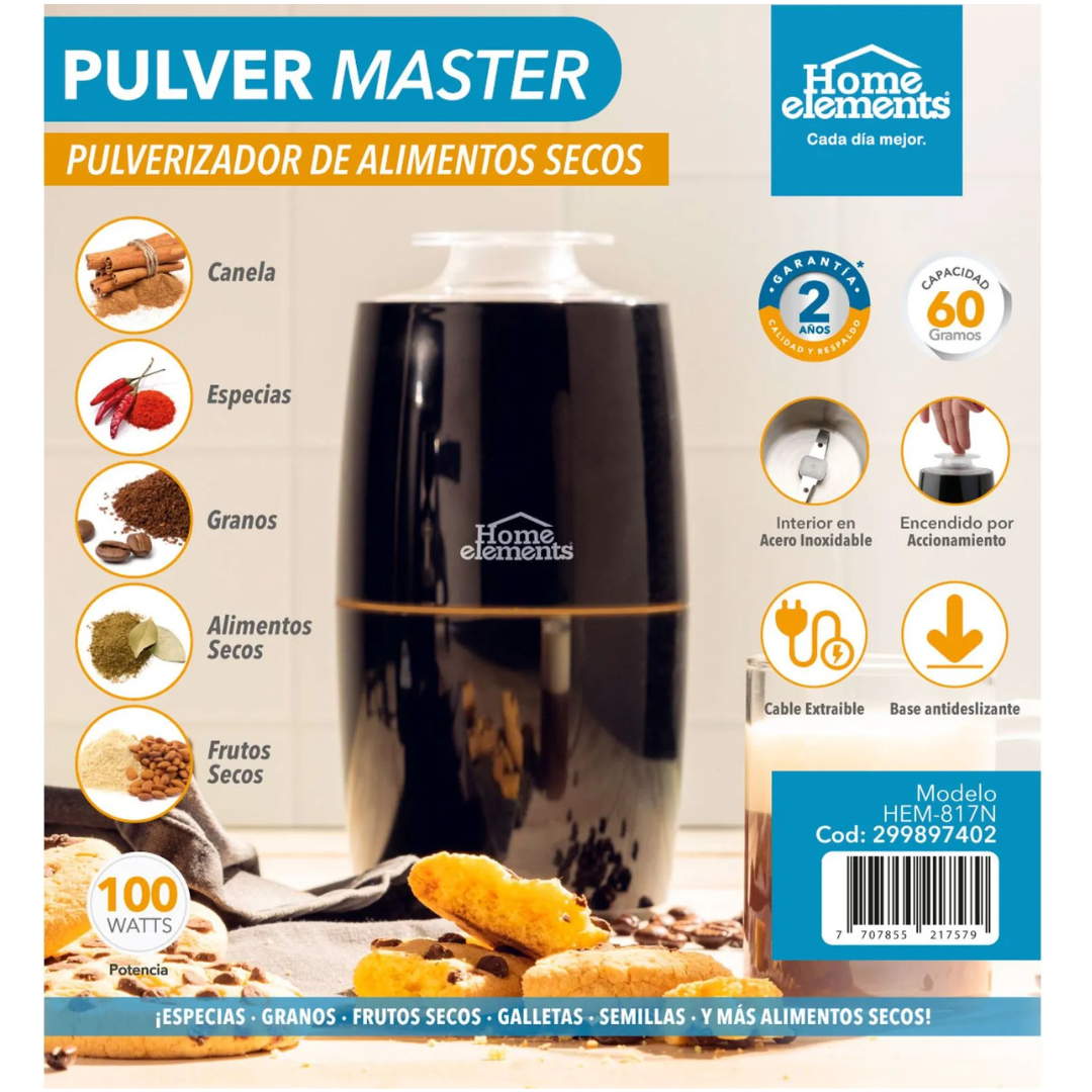 Es un moledor multifunción con el que podrás pulverizar y triturar diferentes tipos de alimentos (Canela, especias, Granos, Alimentos Secos, Frutos Secos). Encendido por accionamiento para mayor seguridad. Cable extraíble para un almacenamiento más fácil.Interior en acero Inoxidableidable que le brindará una vida útil larga al producto. Base antideslizante que te brinda mayor estabilidad y seguridad. Pulveriza en cuestión de segundos. Capacidad de 60 gramos. Hasta 5 tipos de preparaciones, Potencia de 100 W.