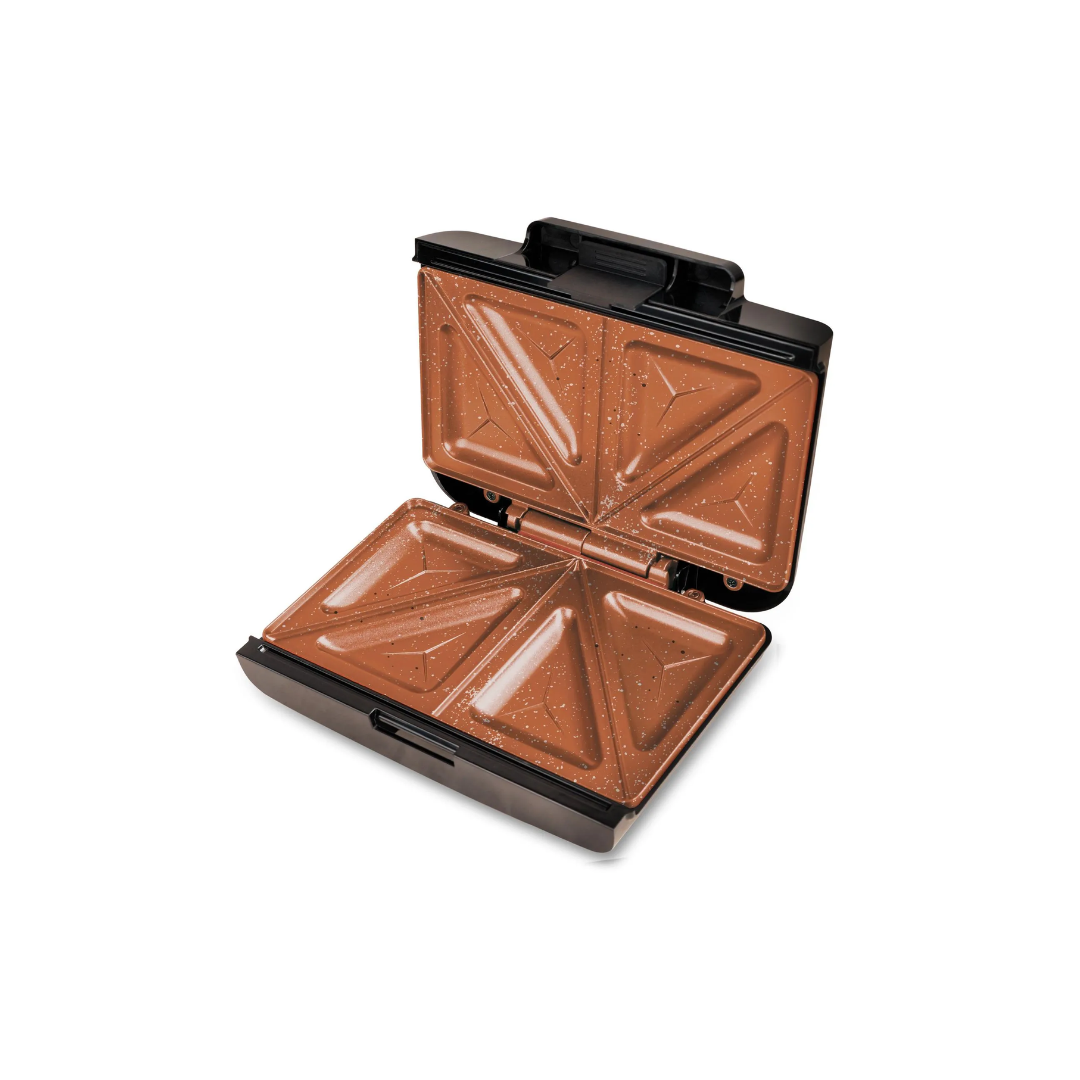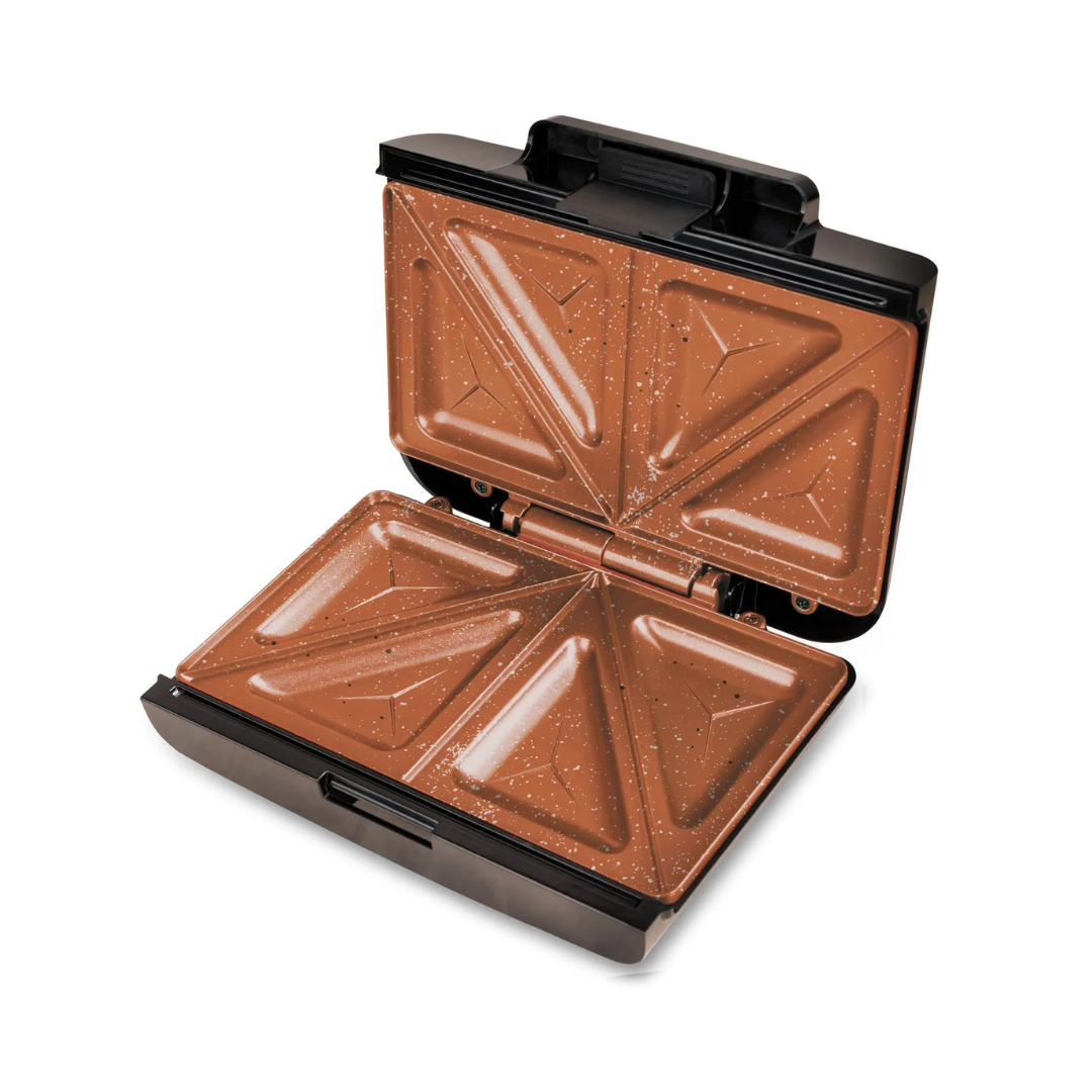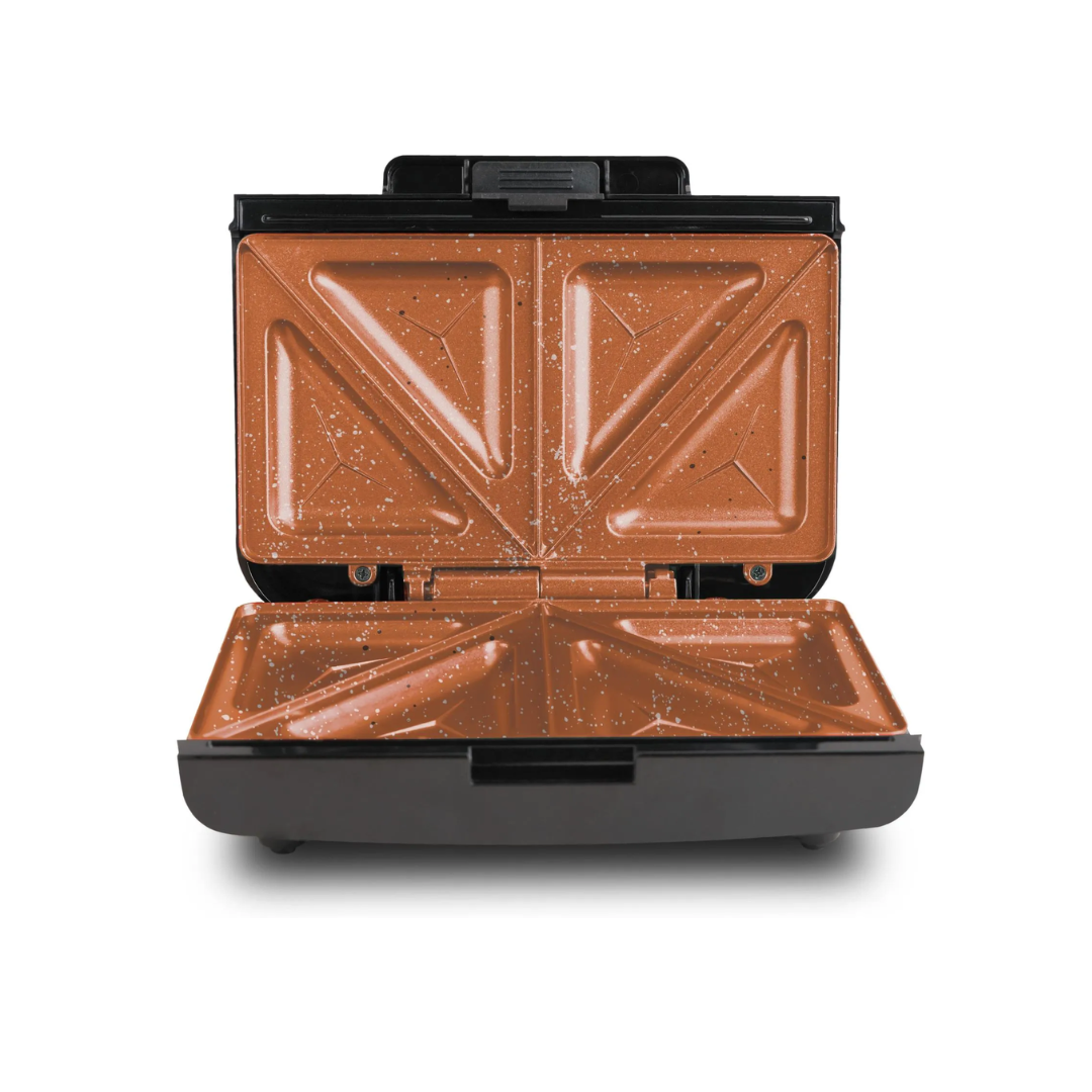 Sanduchera negra de dos puestos cobre, cuenta con cierre seguro, diseño y tamaño real para guardarla en cualqiuier espacio de tu cocina, cuenta con porta cable para faciliar el uso, placas antiadherentes, base antideslizante.