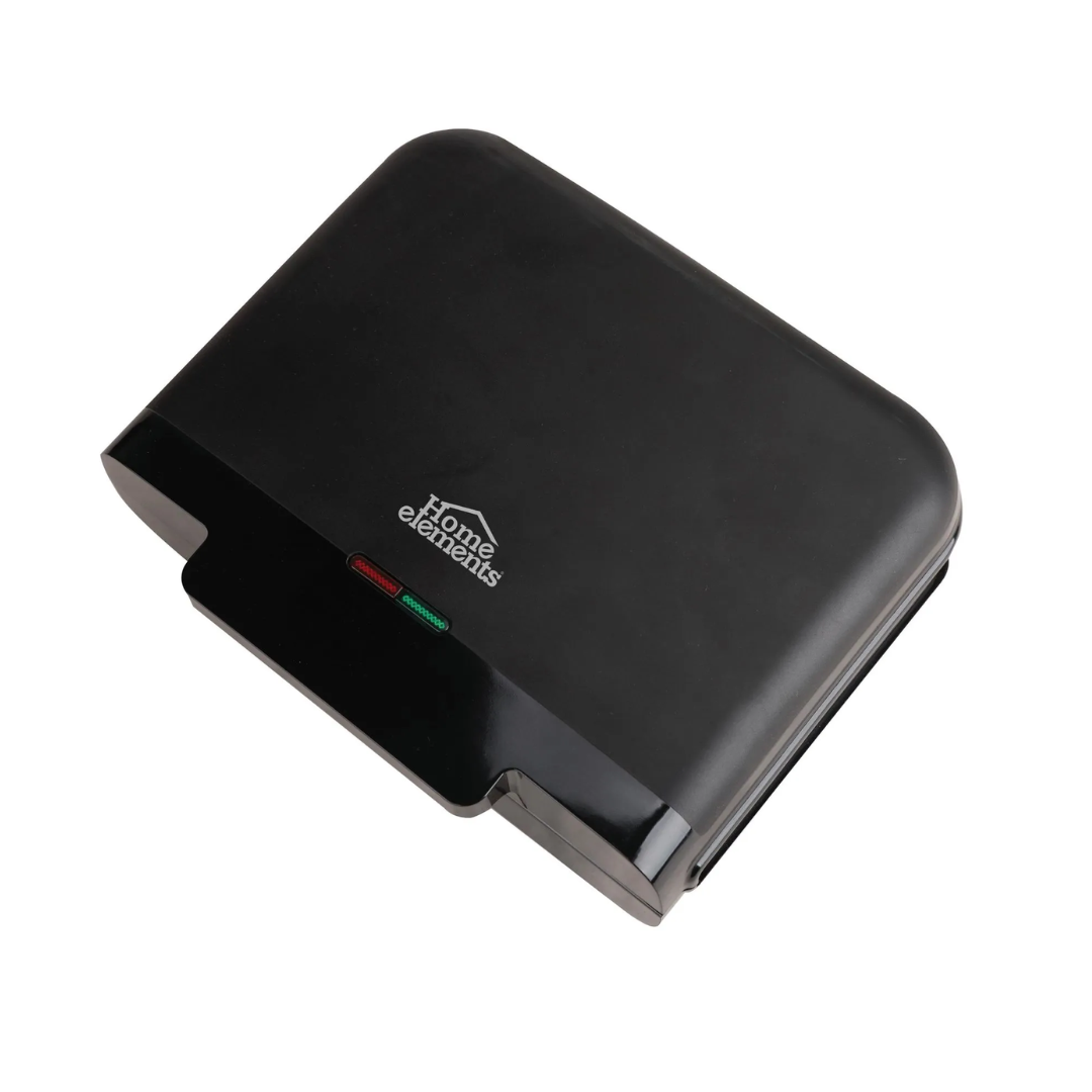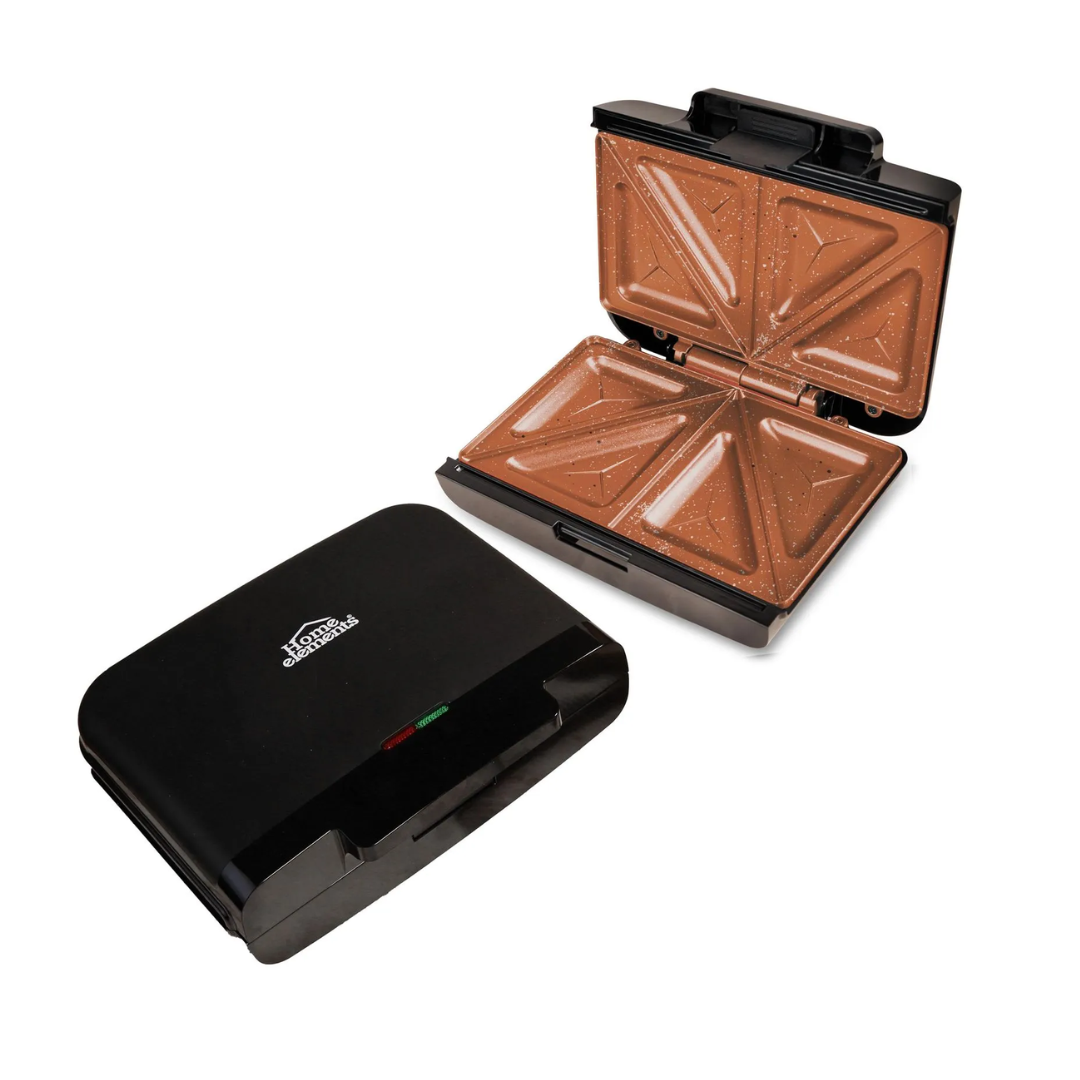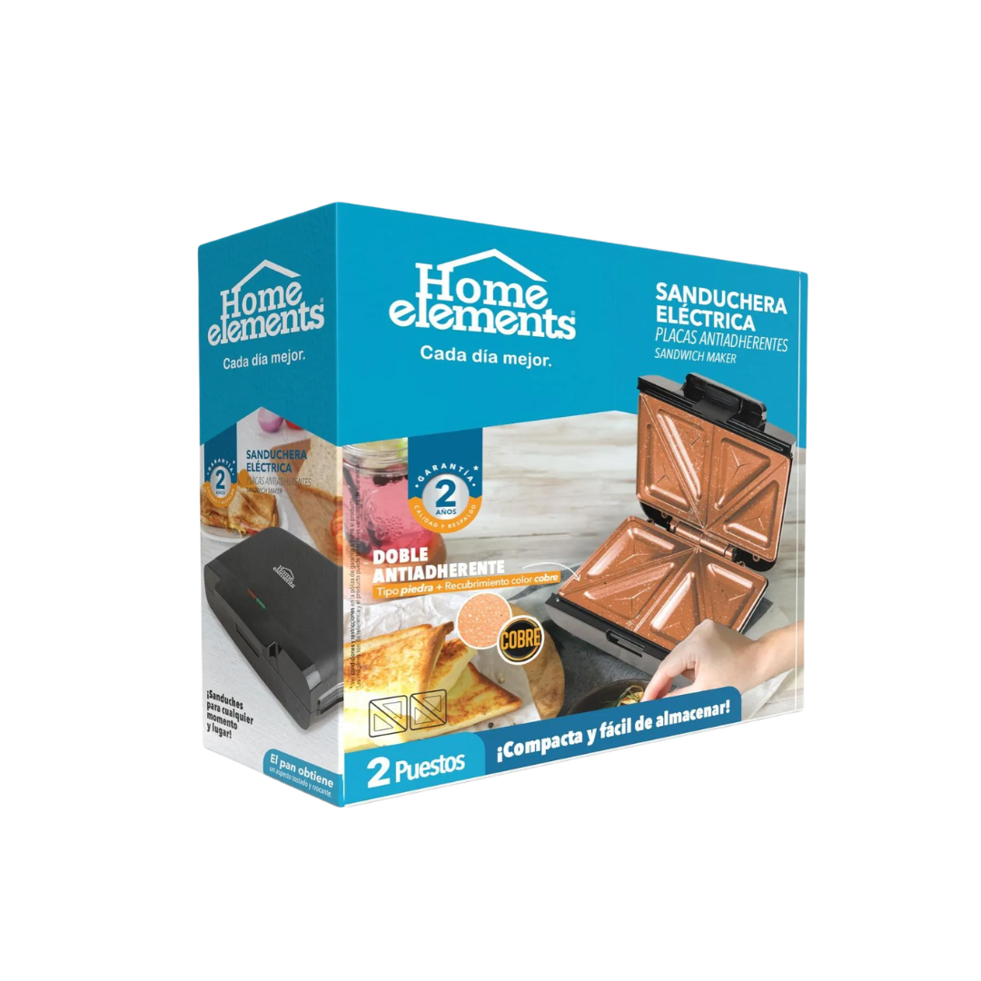 Sanduchera negra de dos puestos cobre, cuenta con cierre seguro, diseño y tamaño real para guardarla en cualqiuier espacio de tu cocina, cuenta con porta cable para faciliar el uso, placas antiadherentes, base antideslizante.